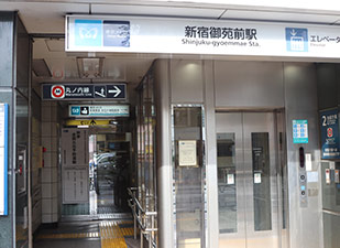 ①新宿三丁目駅C8番出口から地上へ(都営新宿線改札近く)