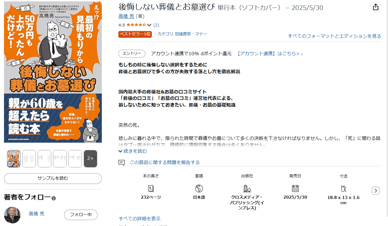 代表著書『後悔しない葬儀とお墓選び』Amazon「人気ギフトランキング」冠婚葬祭部門1位獲得のお知らせ